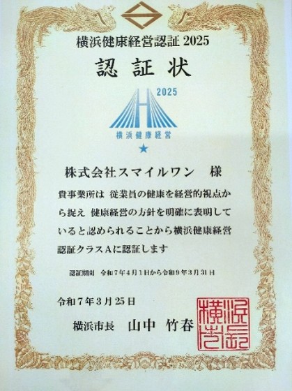先日、認証取得の内定通知をいただき、3月21日(金)に「横浜健康経営企業認証2025」