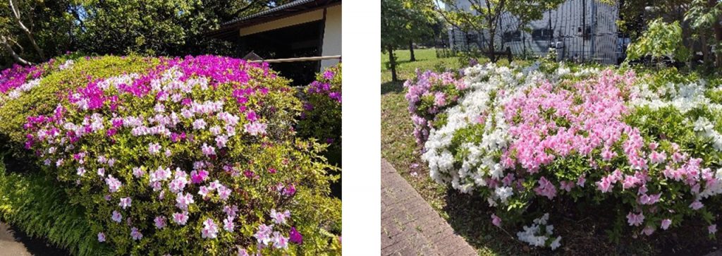 まだ心のどこかに名残惜しさを感じつつも、日常のリズムがまた静かに動き出しました。ふと足元に目をやると、色とりどりの躑躅(つつじ)が今を盛りと咲き誇っています。赤、白、ピンク・・・その鮮やかさは、まるで季節のバトンを手渡すかのようです。
