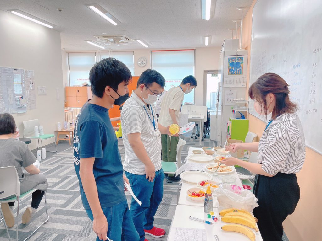 午後の夏祭りは、輪投げやヨーヨー釣りなどのゲーム、かき氷やチョコバナナなどの食べ物系も出店!ゲームを楽しむ方、美味しい食べ物に夢中になる方、雰囲気を楽しむ方…思い思いに楽しんでいらっしゃいました。ゲームに使用したイラストも利用者さんに描いていただき、準備から一緒に行いました。